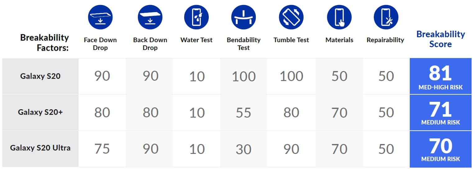 O Galaxy S20 também obteve a pior pontuação no importante teste de queda para baixo, e isso significa um arranjo caro. Assim, não se esqueça de colocar uma película de vidro temperado antes de sair da loja e de uma bela capa.