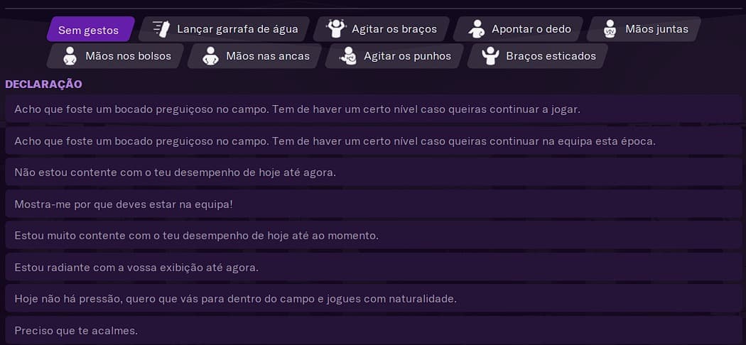traduzidas a gestos, como apontar o dedo, atirar a garrafa de água, etc…. Algo que se repete na forma como lidamos com os jogadores, como é o novo ‘gesto’ de colocar a mão no ombro ou apenas apontar o dedo como se fosse uma crítica.