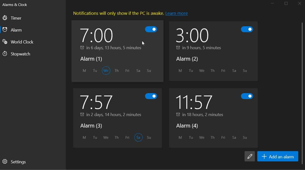 A interface atualizada dos relógios e alarmes é baseada no WinUI 3 e no Fluent Design.