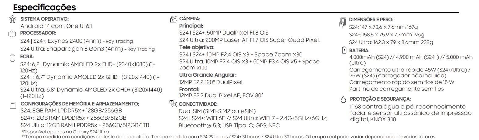 Entretanto, o Galaxy S24+ que sempre se equiparou ao modelo base posiciona-se agora como um topo de gama mais a sério, ao aparecer com 12GB de memória RAM LPDDR5X e os mesmos 256GB de capacidade de armazenamento UFS 4.0 da versão base do S24 Ultra.