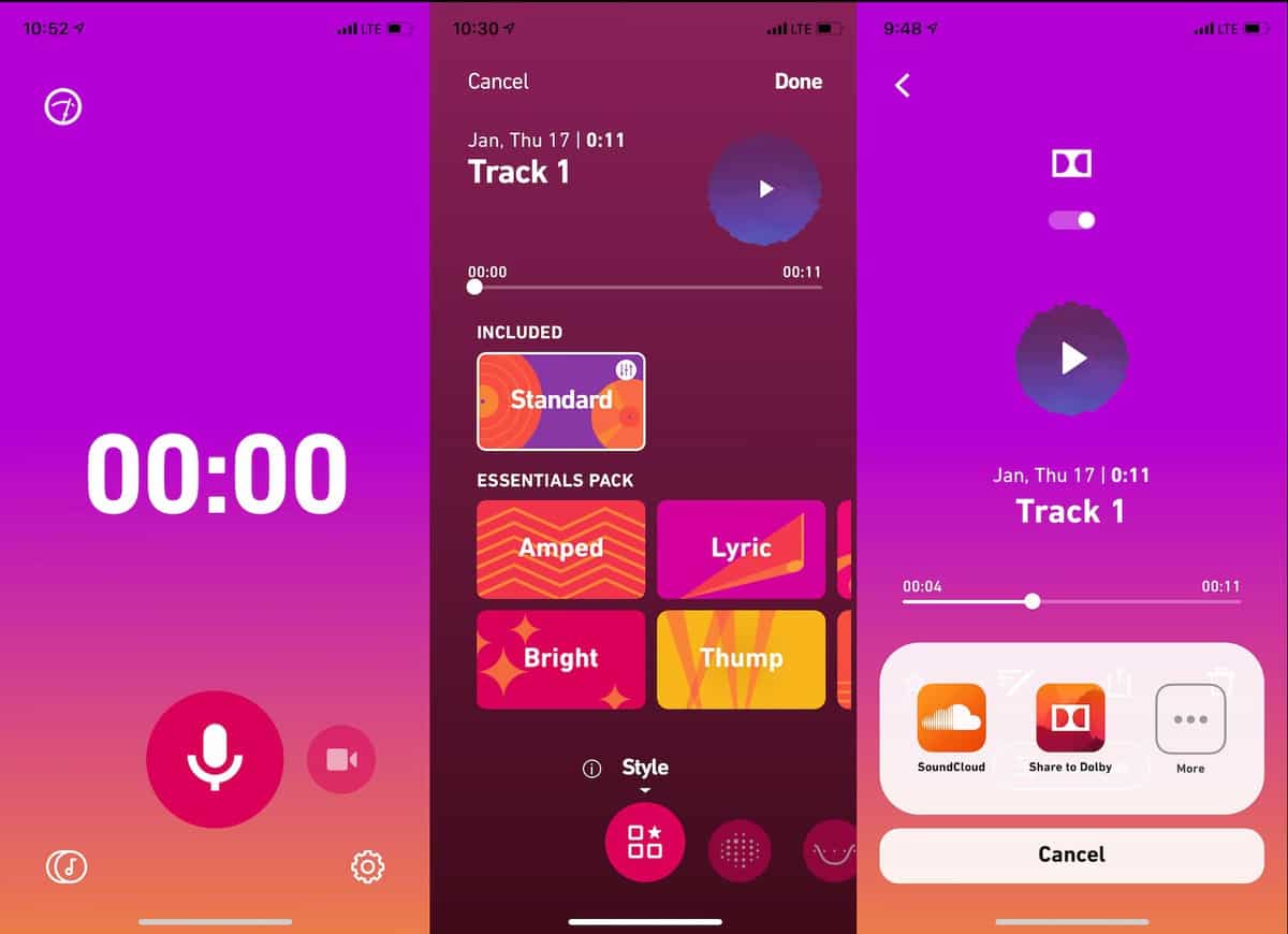 A imagem abaixo revela que para além de eliminar o ruído de fundo a aplicação também vai permitir aos utilizadores ajustarem os agudos e os graves. É também possível ajustar diversos elementos sonoros graças ao Dolby Dynamic EQ. Para além disso, pode gravar as suas atuações ao vivo com o nível de volume ideal.