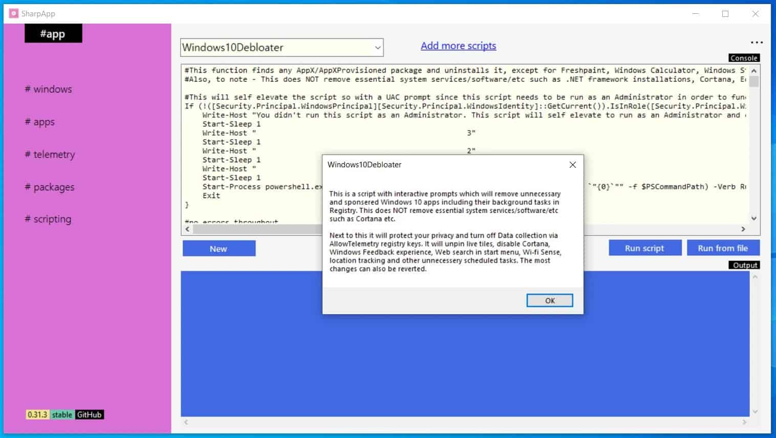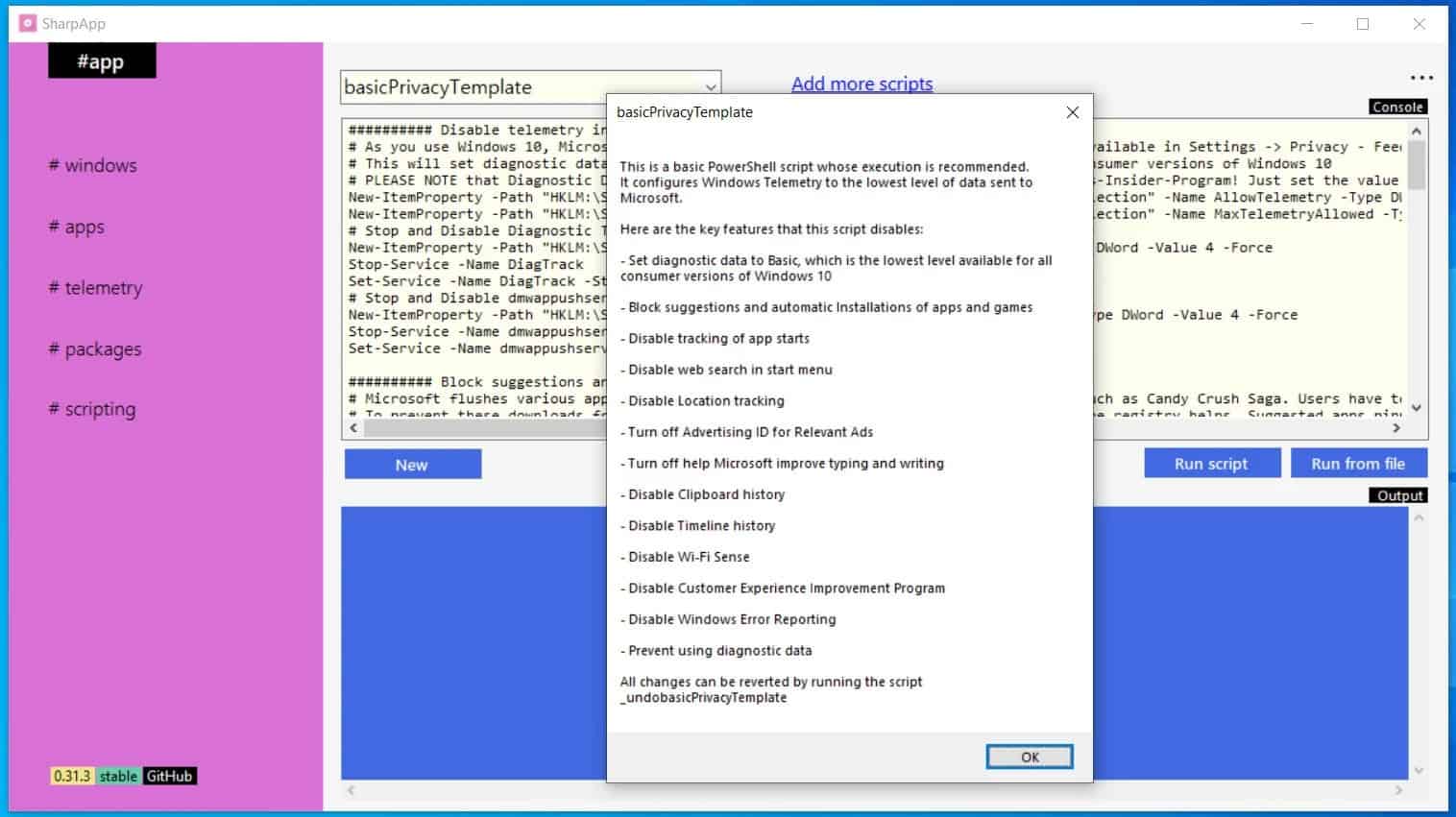 Para usar um modelo instalado, tem de ir à secção Scripting e escolher Installed PowerShell scripts. O SharpApp vem com os scripts appsPrivacyTemplate (desabilita a recolha de dados em aplicações de terceiros) e os scripts basicPrivacyTemplate (desabilita a recolha de dados do Windows 10).