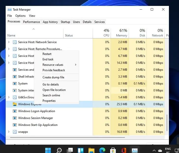 Agora procure por Windows Explorer e clique por cima desse processo com o botão direito do rato. A seguir escolha a opção Restart.