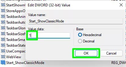Depois defina o valor da chave Start_ShowClassicMode para 1.
