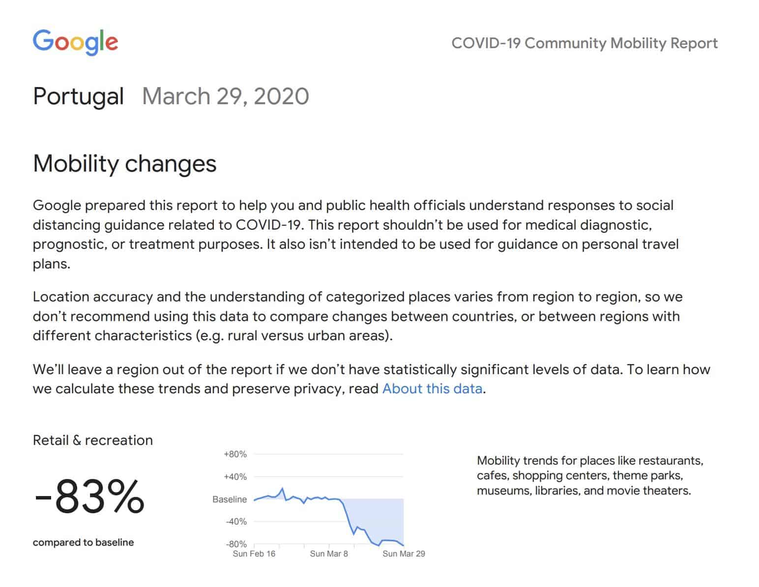 Portanto, a Google está a usar os dados de localização provenientes do Google Maps (de pessoas que permitem a sua recolha), para mostrar quem está realmente a cumprir a quarentena. Mas calma! Se está com medo que o Google dê com a língua nos dentes, pode estar descansado, é tudo anónimo.
