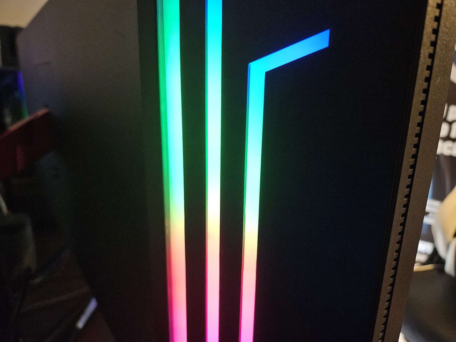 Para além disso, tem os efeitos RGB na parte de trás, que ficam muito bem, especialmente se tiver o monitor encostado a uma parede, ou uma qualquer superfície capaz de refletir luz.