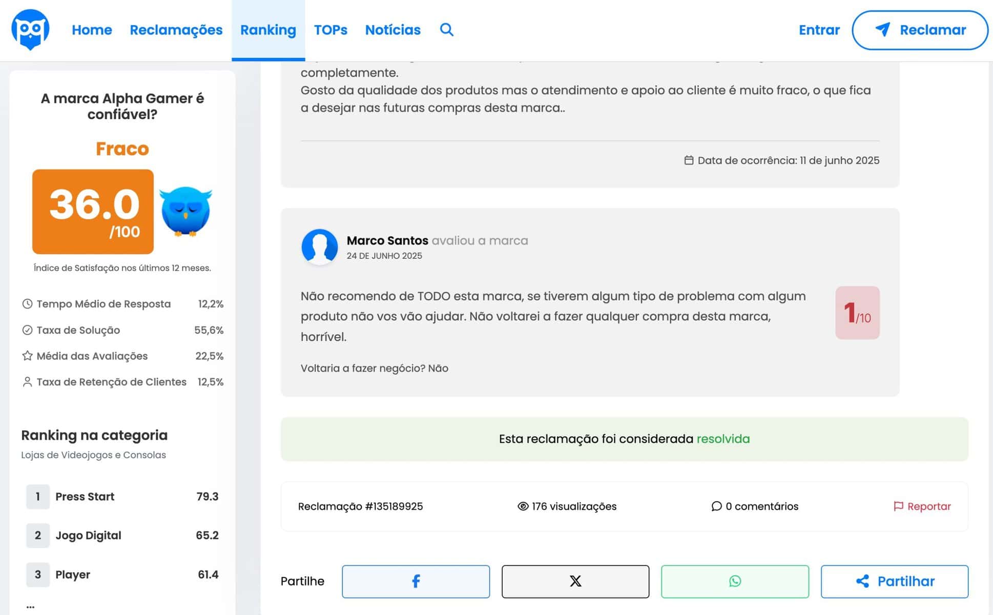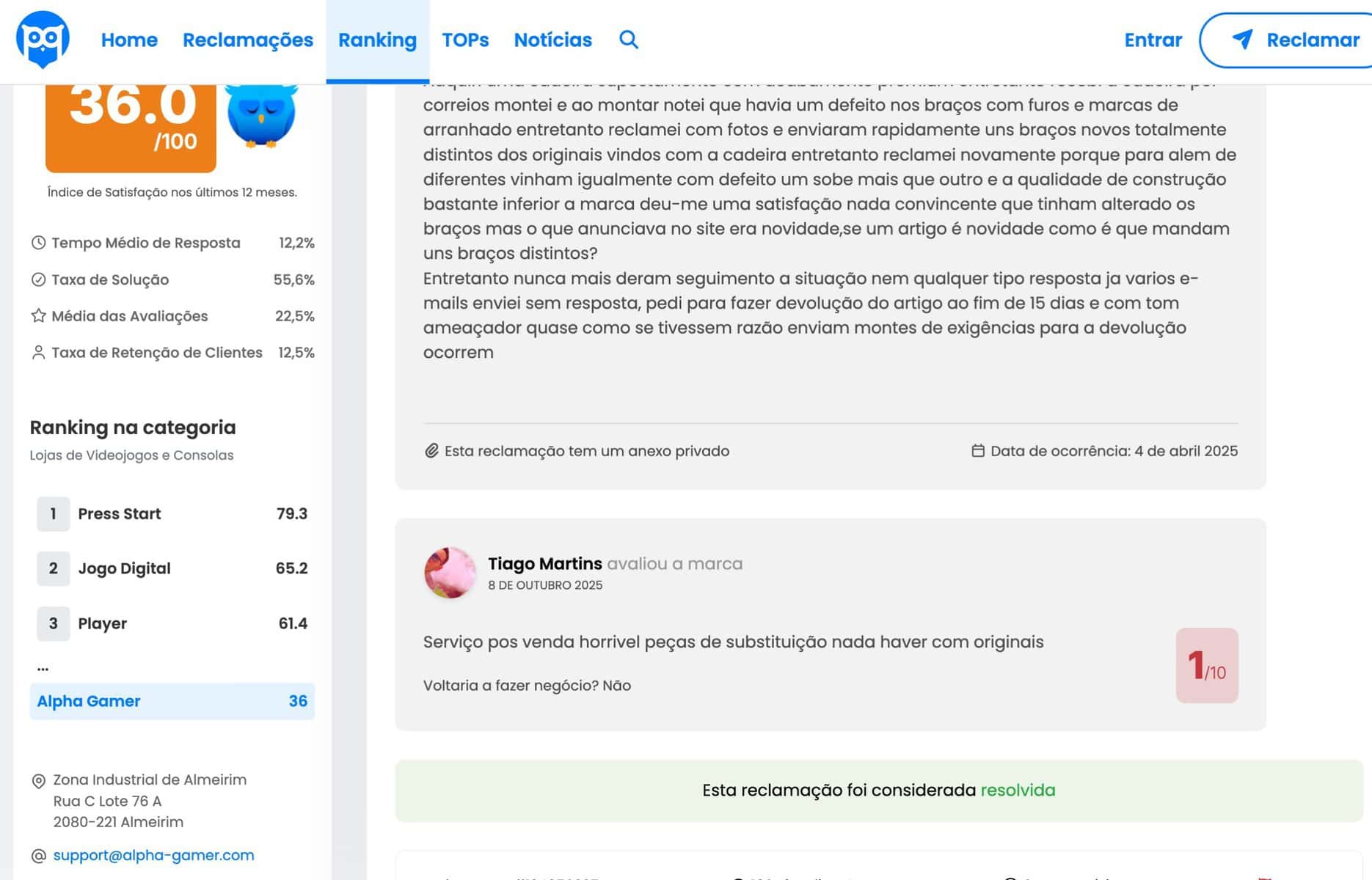 A Alpha Gamer tem acumulado relatos públicos de consumidores a apontar o mesmo problema: produtos que chegam com defeito ou incompletos e um pós-venda que, em vários casos, responde tarde ou falha o seguimento prometido. No Portal da Queixa, a página da marca apresenta, nos últimos 12 meses, um Índice de Satisfação de 36/100 (classificação “Fraco”), tempo médio de resposta superior a 15 dias e taxa de solução de 55,6%. São indicadores que pesam na reputação e ajudam a explicar a frustração de quem compra uma cadeira “premium” ou uma secretária elevatória e precisa de apoio rápido quando algo corre mal.