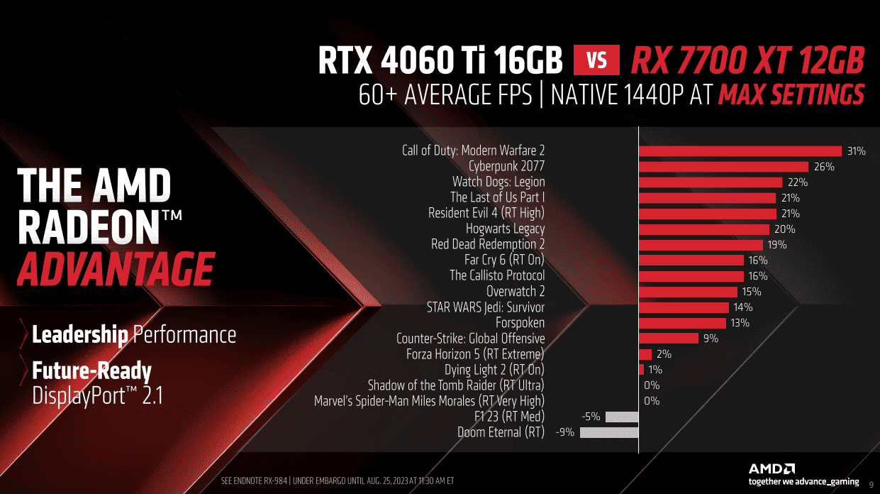 Dito isto, a RX 7700 XT tem a missão de ficar por cima da RTX 4060 Ti, enquanto a RX 7800 XT tem a missão mais complicada de ficar por cima da RTX 4070. Ambas a preços um pouco mais baixos face aquilo que a NVIDIA tem vindo a oferecer.