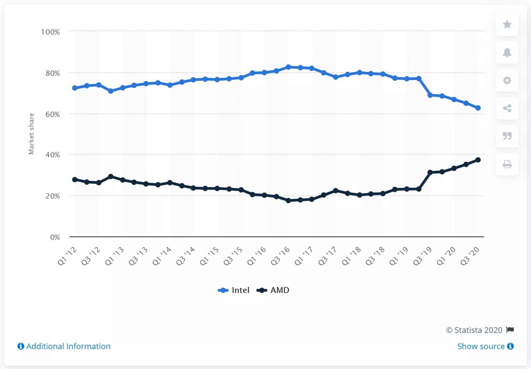 Em suma, a AMD já tem cerca de 37,3% da quota de mercado no seu lado. O ponto mais alto desde que a tabela tem o seu início (2012). Similarmente, a quota de mercado da Intel também está no seu ponto mais baixo durante o mesmo período.