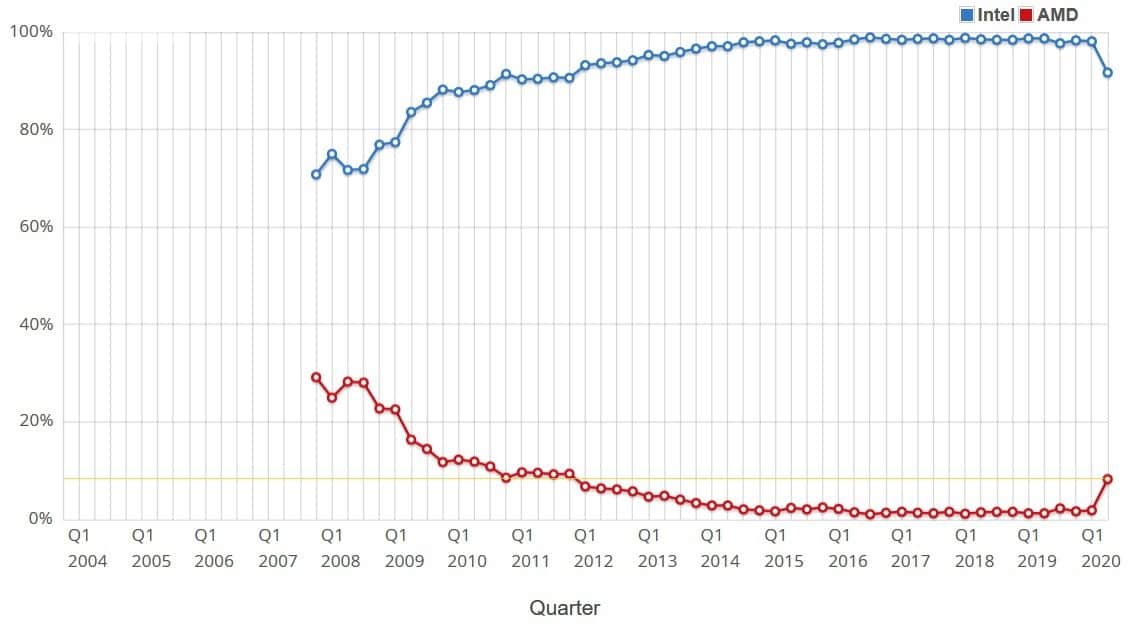 Ver o crescimento da AMD no mundo dos PCs Desktop e portáteis tem sido algo super interessante, com a quota de mercado a fugir das mãos da Intel diretamente para as mãos da sua velha rival.