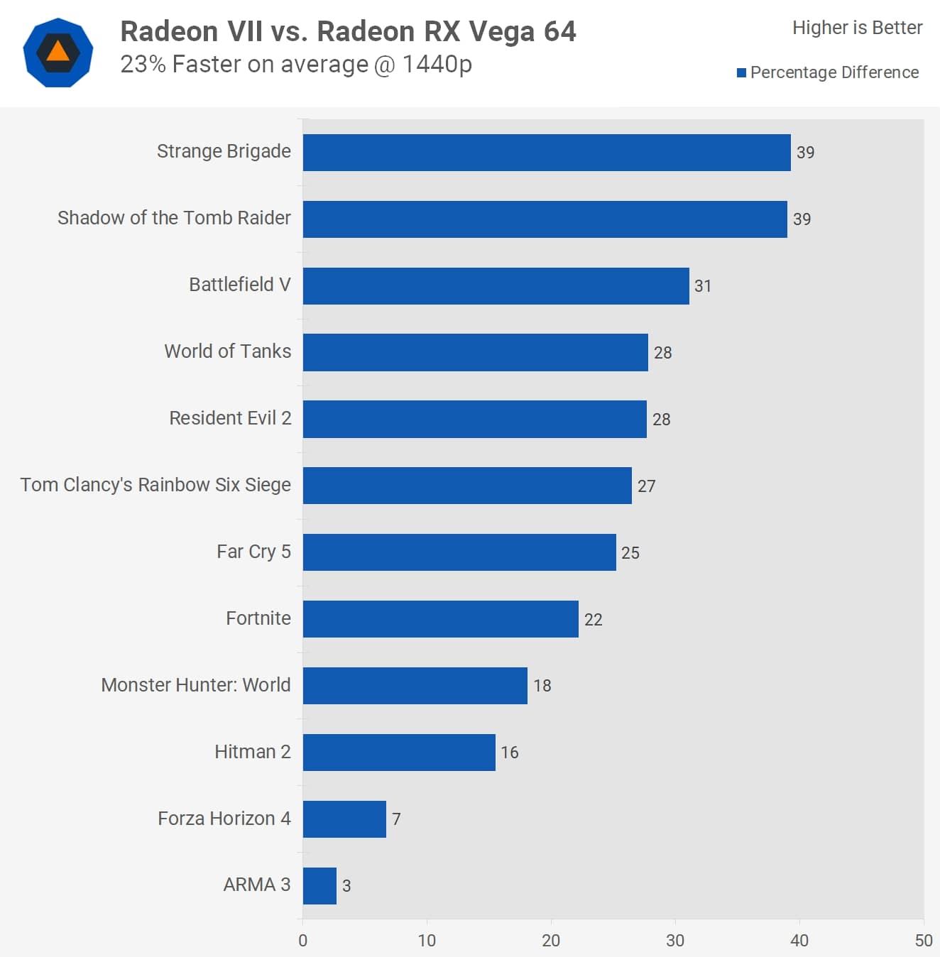 Bem… É uma placa gráfica de 7nm! Contudo, é baseada na mesma arquitetura das velhinhas Vega 65 e 64. Por isso, apesar de o GPU ser mais eficiente, sendo 32% mais pequeno, e com mais 7% de transistores… A performance pode não ser o que muitos esperam.