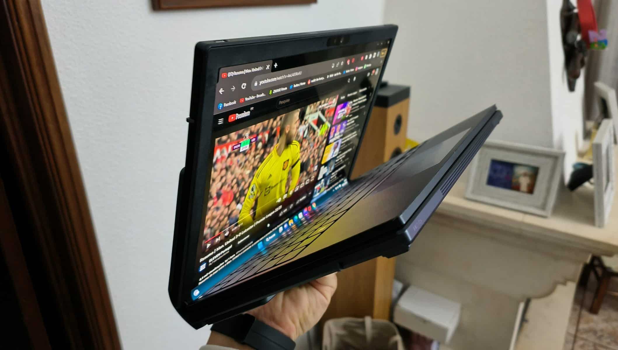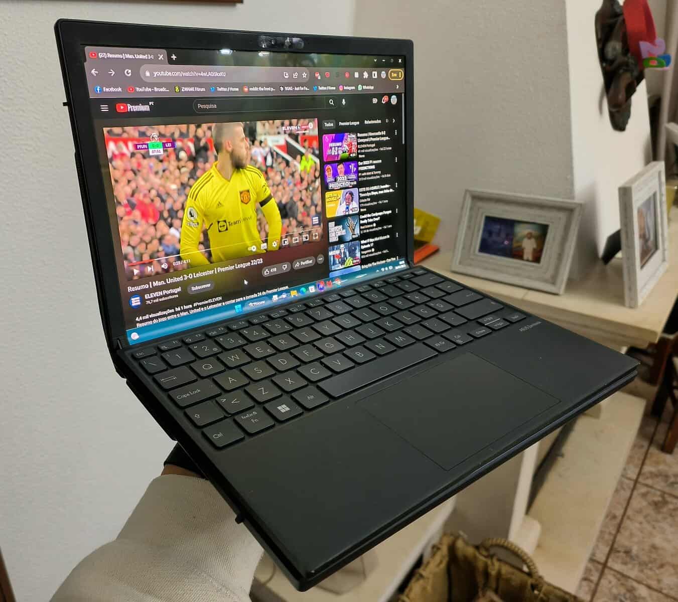Dito isto, consegue imaginar ter uma máquina computacional que pode servir como portátil convencional graças ao teclado Bluetooth que pode ser encaixado magneticamente na parte de baixo. Que pode servir como um media center, para ver conteúdo multimédia com toda a qualidade possível, e pode até servir como uma espécie de substituto ao seu PC Desktop, graças ao tamanho do ecrã completamente desdobrado, que pode ser apoiado em qualquer lado? É novidade! É next-gen!