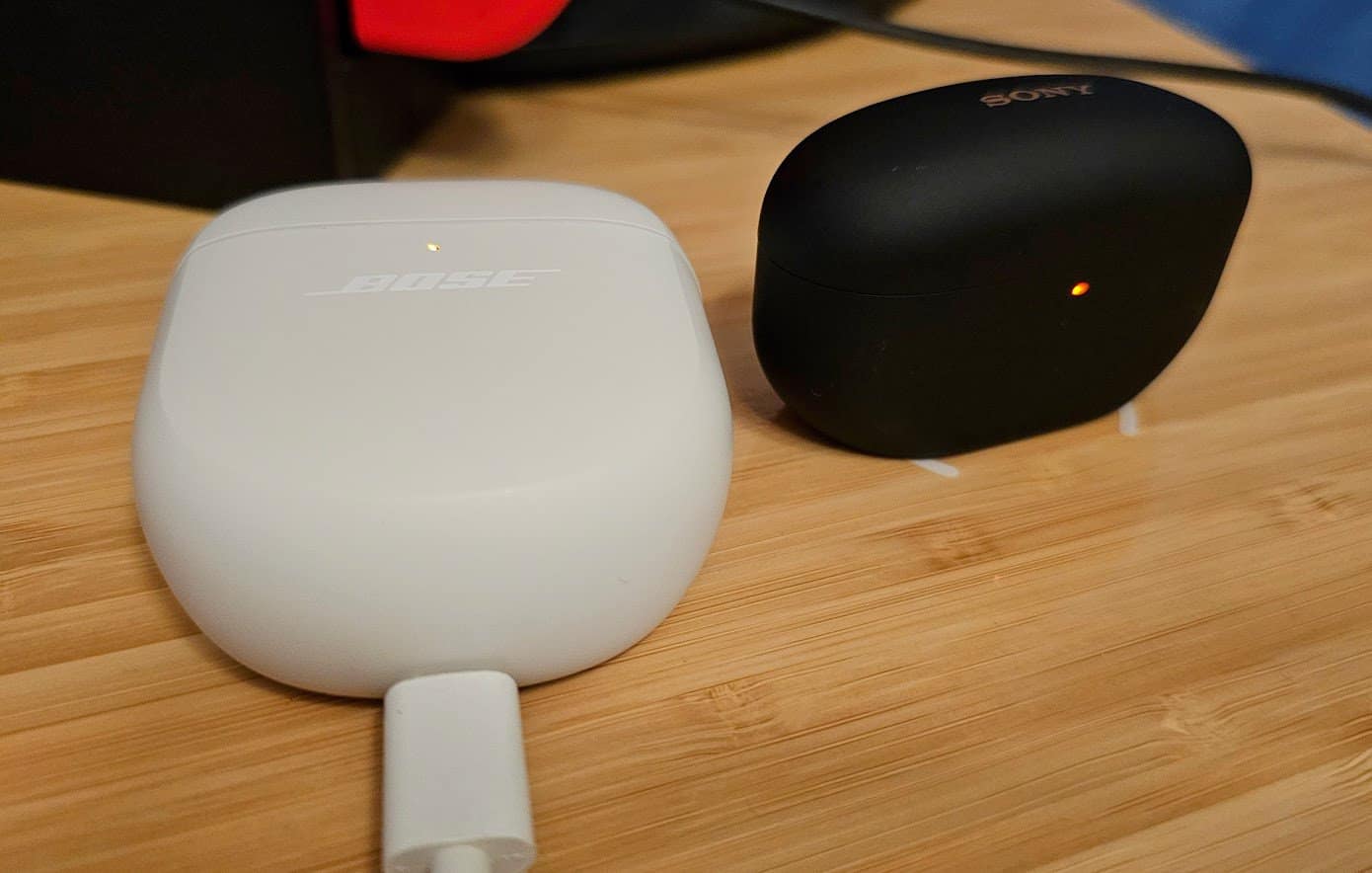 Porém, enquanto a Sony oferece 2 cargas completas na caixa, a Bose oferece 3! Essa mesma caixa pode ser carregada por USB-C e… Mais nada. Infelizmente, a Bose decidiu meter o carregamento sem fios na gaveta, o que é realmente uma pena, e um dos maiores pontos negativos que este produto poderia ter nesta gama de preço.
