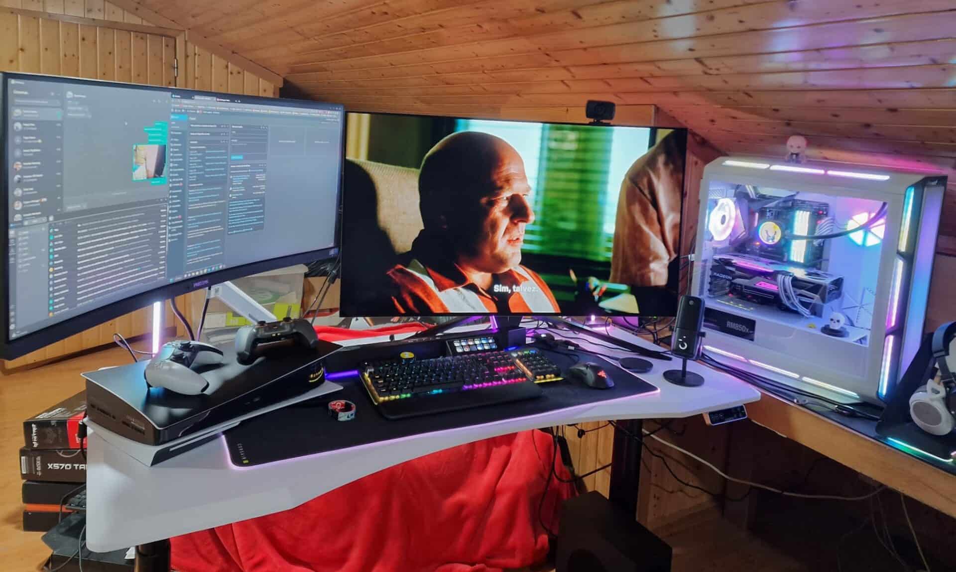 Atualmente, tenho 2 monitores, um deles num braço que comprei à parte, uma PlayStation 5, uma soundbar, entre outros extras. Também já tive duas televisões de 42”, com a PS5 à mistura.