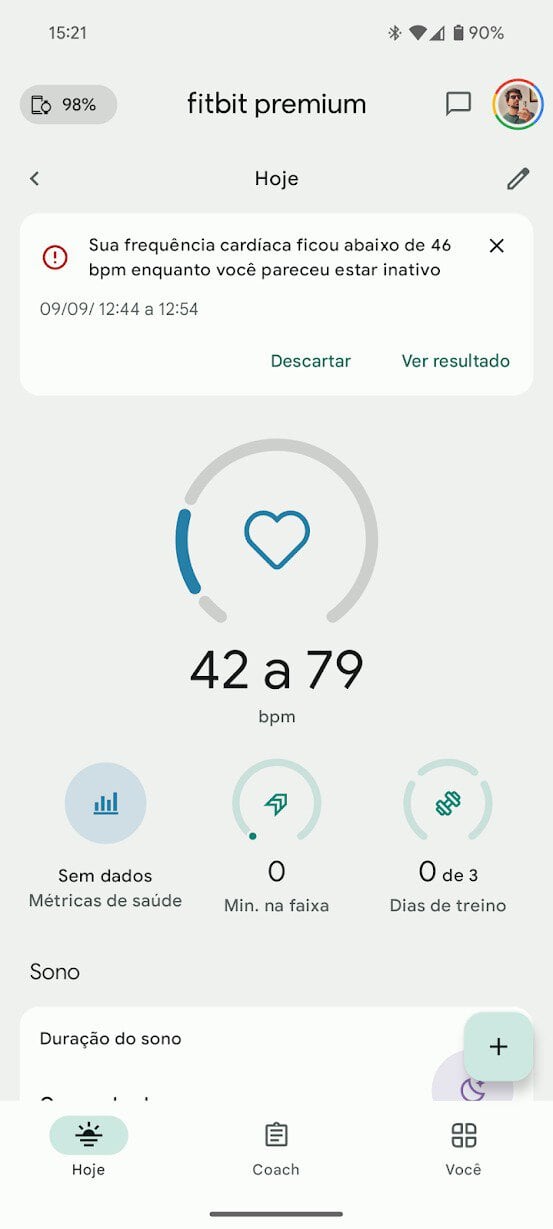 Ecrã Inicial com resumo de informações, onde temos especial atenção a mudanças cardíacas que podem ser estranhas. (No meu caso, como fui atleta federado durante duas décadas, tenho uma frequência cardíaca muito baixa em repouso. Algo que o Pixel Watch 3 rapidamente aponta!)