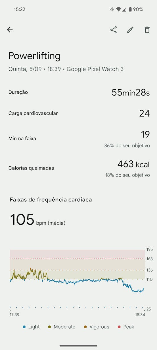 A qualidade do Pixel Watch 3 é especialmente visível em treinos com mais atividade cardiovascular, como é o exemplo de Padel, onde todas as flutuações de intensidade ficam sempre muito bem aparentes nos gráficos que a app Fitbit apresenta.