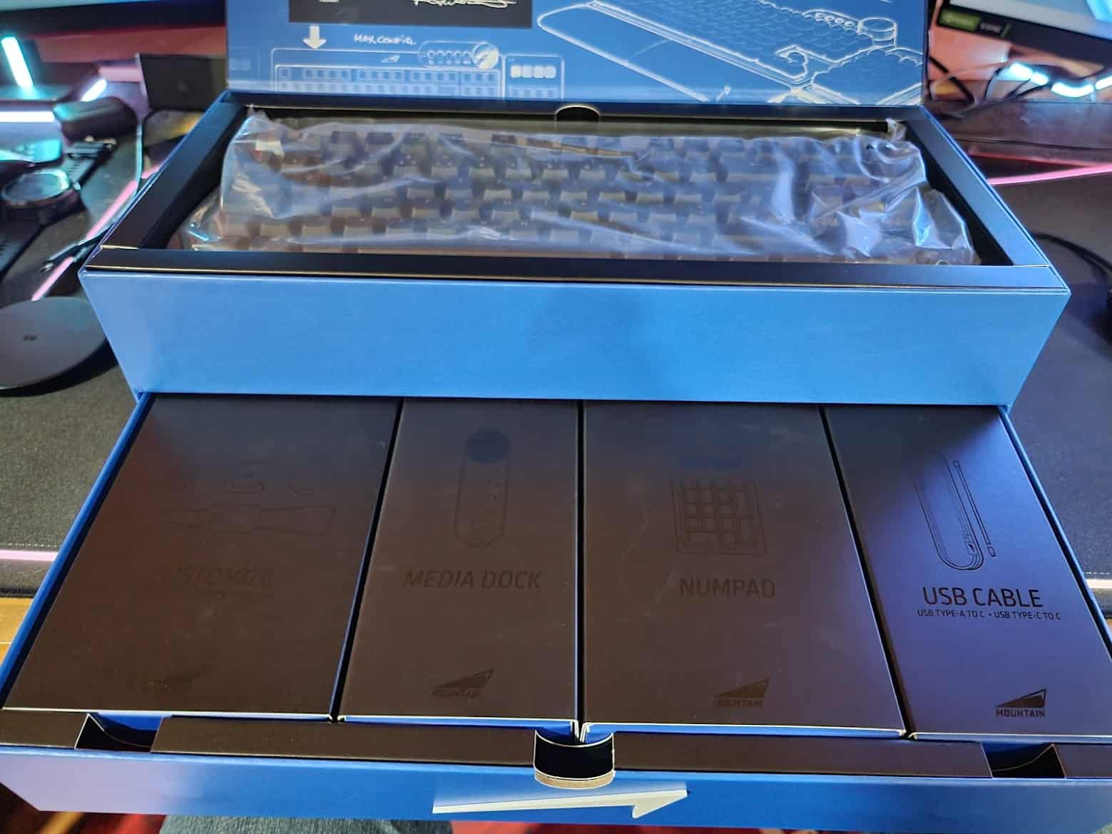 - (Neste caso, como módulos extra, temos o NumPad, o módulo multimédia, apoios magnéticos para subir ou descer o teclado, alguns switches extra, e ainda o descanso para os pulsos.)