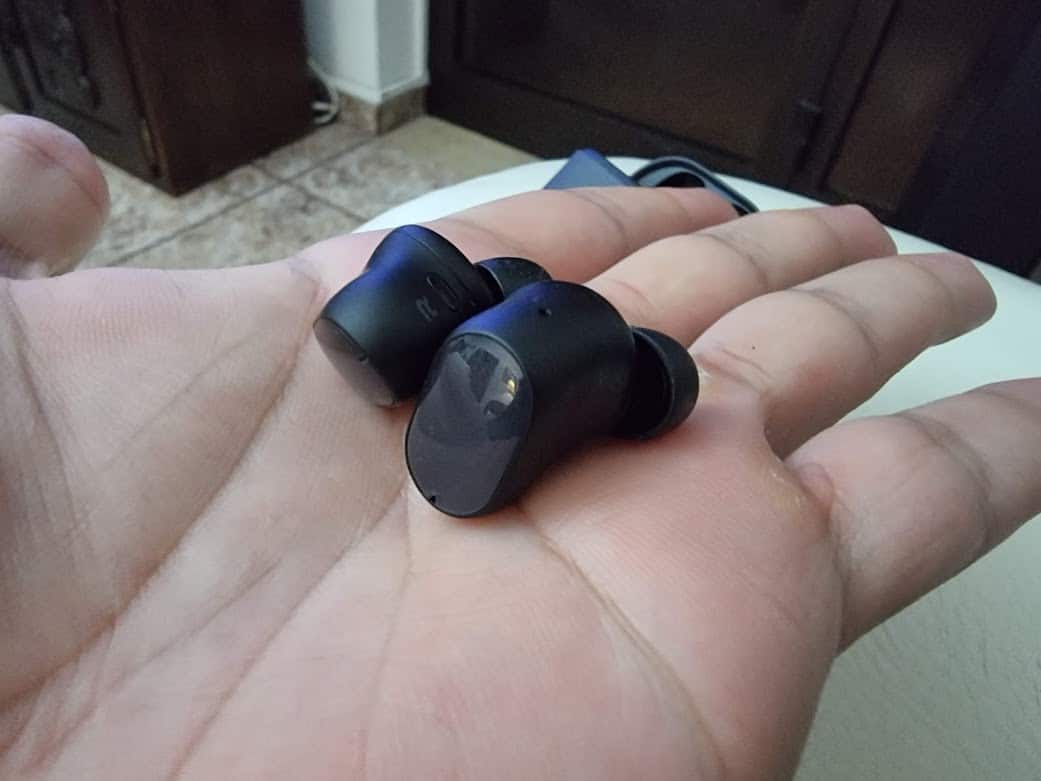 Além de tudo isto, também temos in-ear detection, ou seja, os buds percebem quando os tira, pausando a música, e também percebem quando os volta a meter, retomando o que tinha ficando ao pausa.