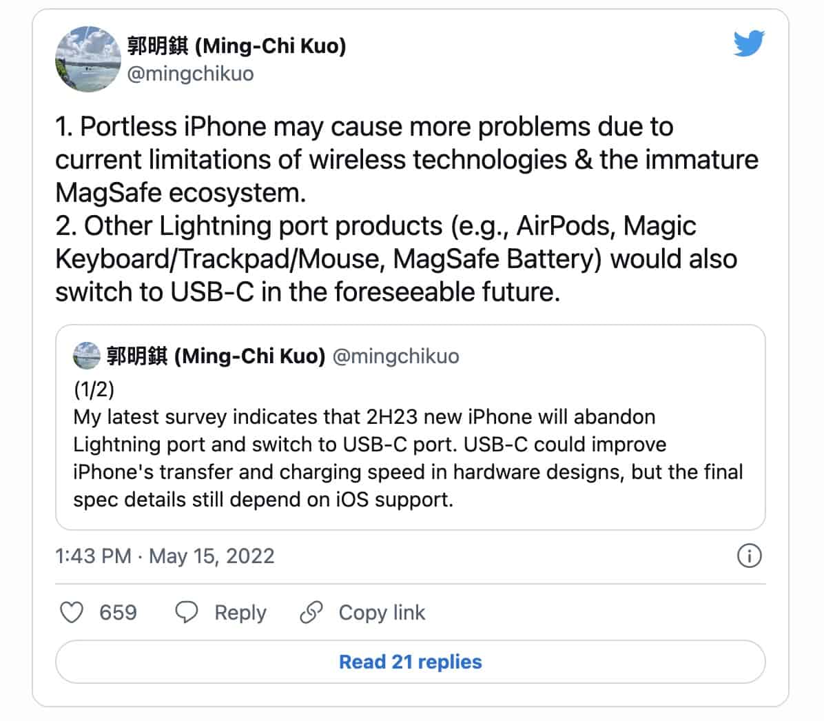 É verdade que para além da integração desta porta, também se falou do lançamento de um iPhone sem qualquer porta de carregamento. No entanto, de acordo com o analista Ming-Chi Kuo, a Apple ainda não está pronta para lançar iPhones sem porta. Apesar das tecnologias Wireless já estarem muito evoluídas ainda não são bem o mesmo. Como tal, a presença de uma porta é mesmo necessária.