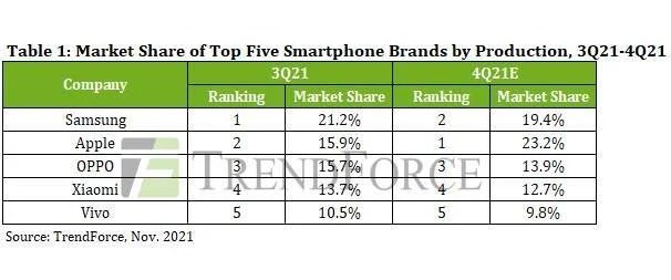Voltando a 2021, a Oppo, Xiaomi e Vivo são terceiro, quarto e quinto respetivamente.