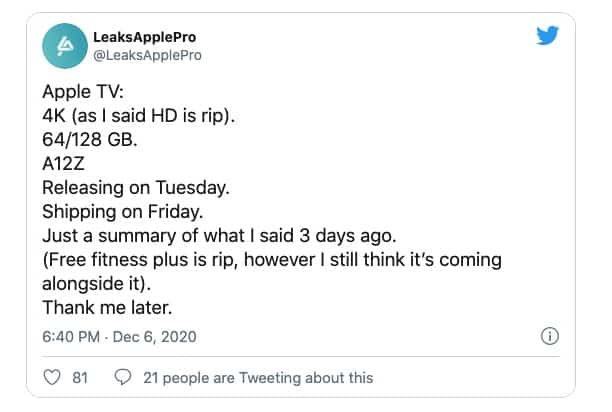 Entretanto o leakster revela que a Apple pode saltar a variante HD da Apple TV e deve lançar apenas um modelo 4K. Entretanto e no que diz respeito à capacidade de armazenamento temos 64 ou 128 GB. Outro pormenor importante é que a caixa vem uma menção ao serviço “Apple Fitness+”. Ainda assim, o leakster não tem a certeza se a Apple disponibiliza uma assinatura gratuita para quem comprar a Apple TV, ou é apenas uma oferta de 2 ou 3 meses.