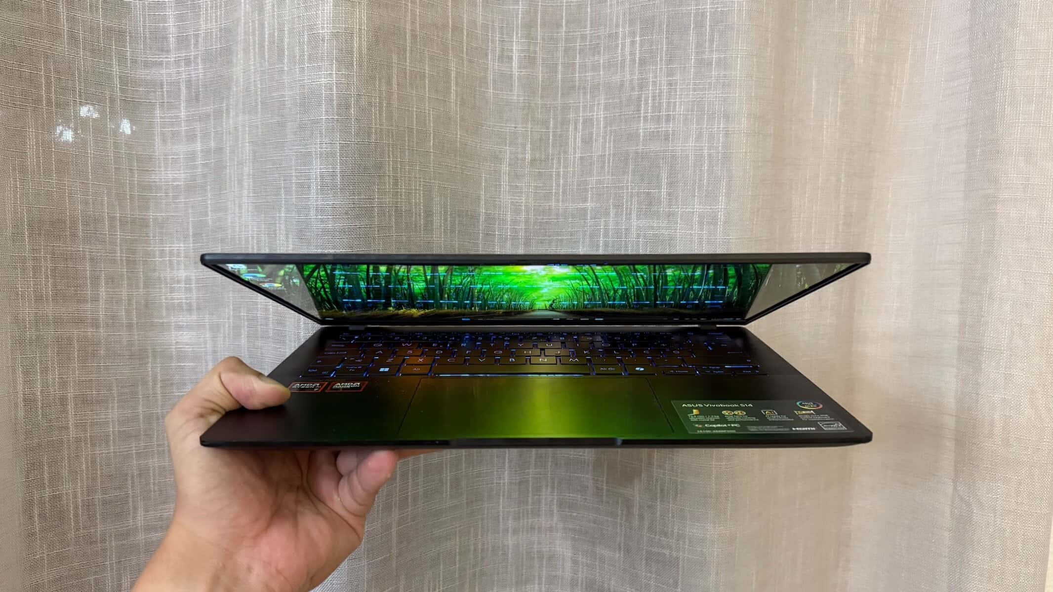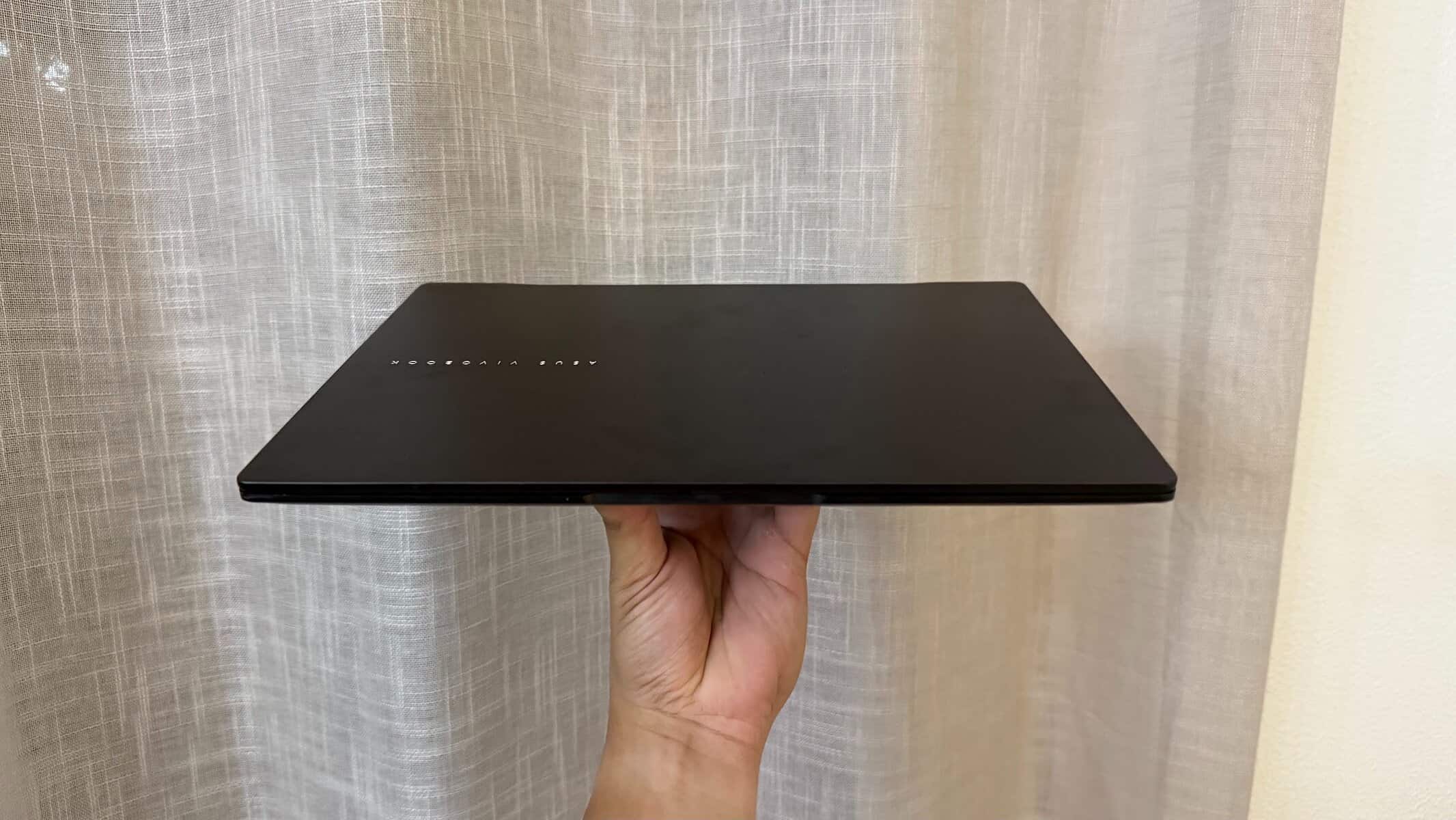 Parece premium, é todo em metal, tem bom ar, e o toque é agradável. A cor Jade Black ajuda a dar-lhe aquele aspeto discreto com um toque profissional. Mas depois reparas nos detalhes: a marca “Vivobook” está ali bem visível e as margens do apoio de mãos podiam ser… bem… menos afiadas.