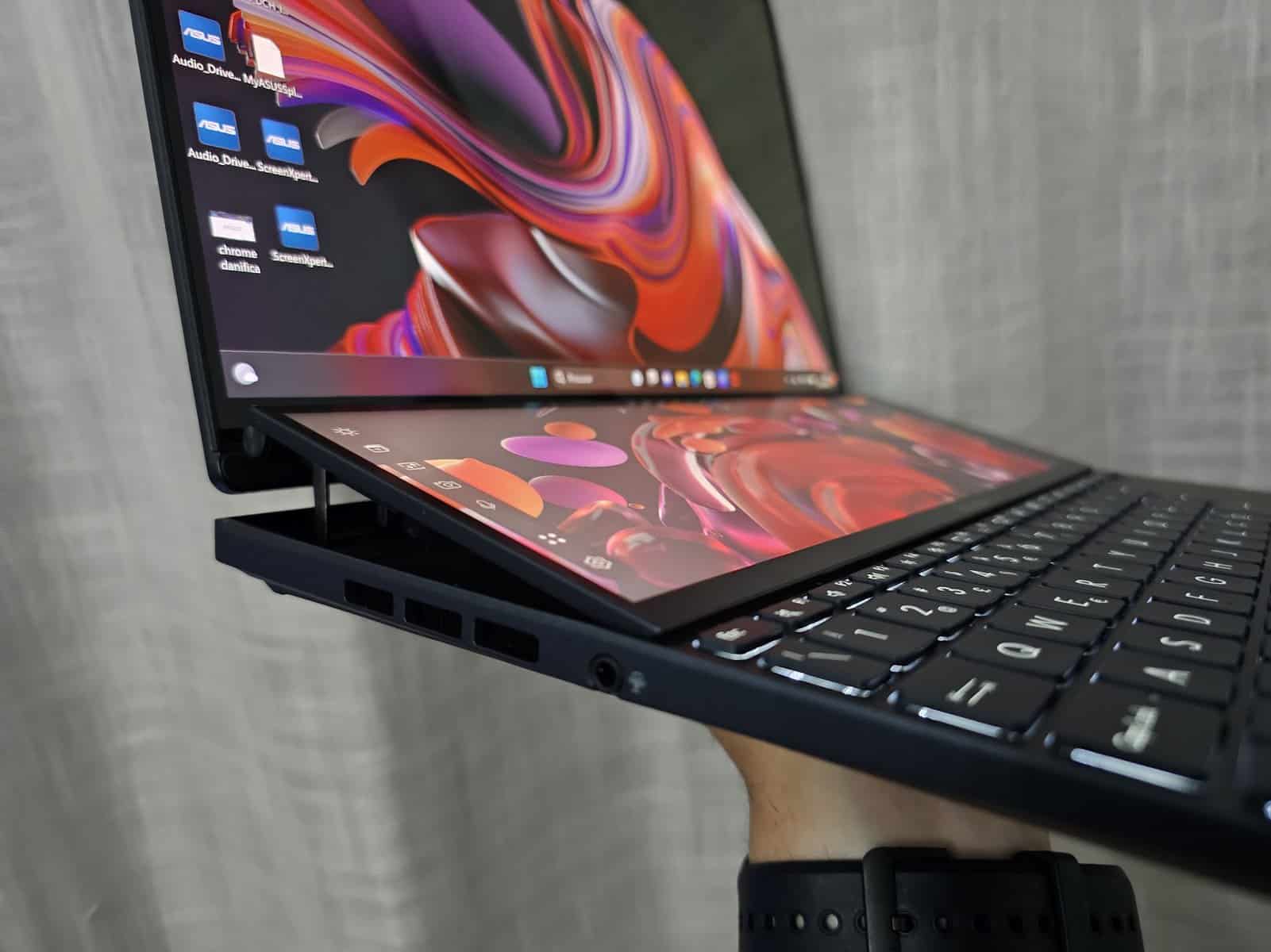 Quando aberto… Bem… Começa a magia! O ecrã secundário melhorou muito ao longo dos anos, e à similaridade do ano passado, continua a contar com um mecanismo que o levanta um pouco para melhorar o ângulo de visualização, cooling do portátil, e também saída de som. Porém, ao contrário do ano passado, a imagem chave não está apenas no ecrã secundário. Pela primeira vez, este portátil da ASUS também se parece orgulhar do seu ecrã principal, agora OLED, e por isso, cheio de qualidade de imagem. (Vai até aos 120Hz, o que é pura e simplesmente a cereja no topo do bolo).