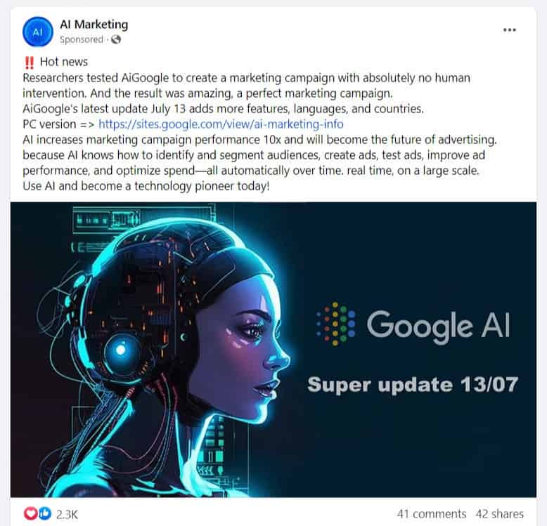 Dito isto, os criminosos pirateiam páginas verificadas do Facebook e mudam-lhes o nome para marcas de confiança como Facebook, Meta, Google AI, Bard, entre outras. Estas páginas com marcas verificadas são depois utilizadas para publicar anúncios com ligações a malware.