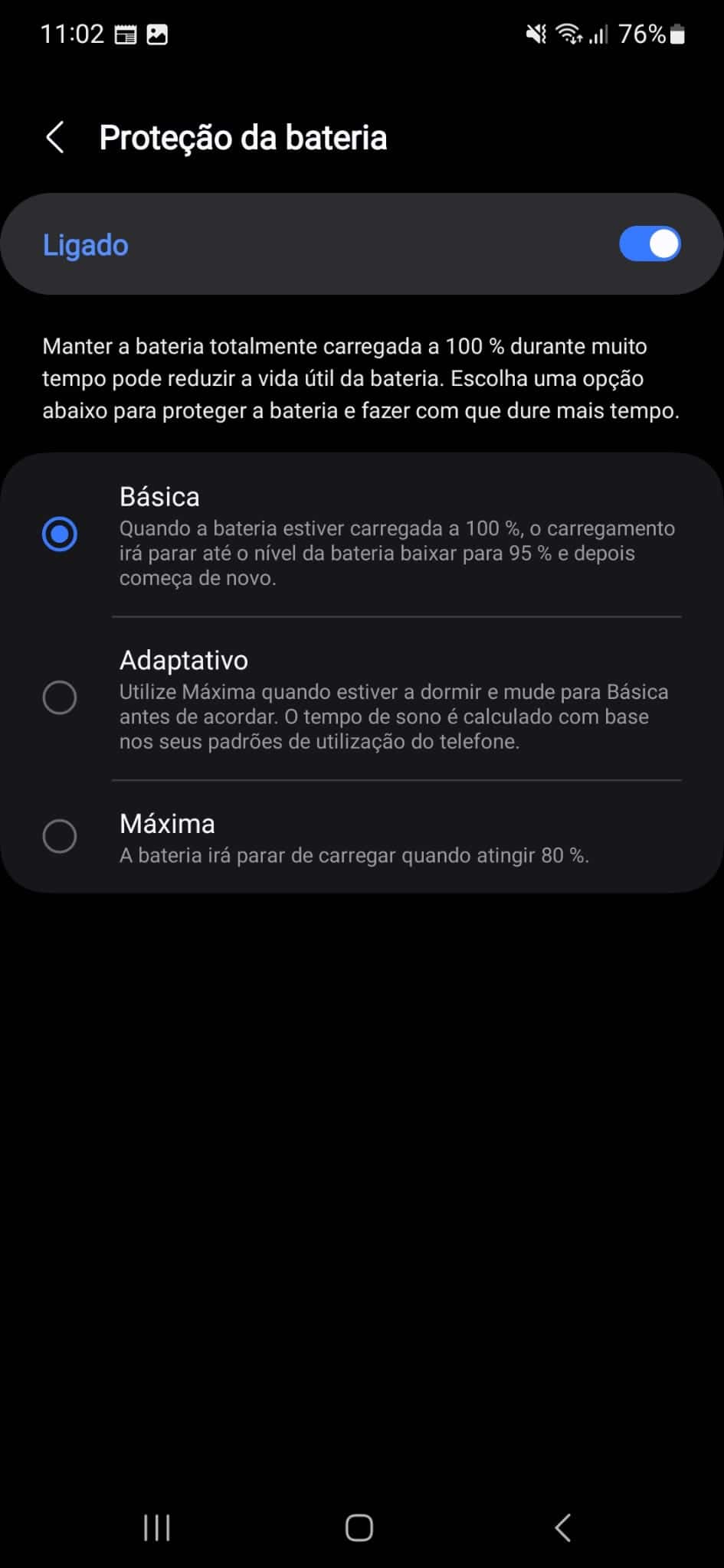 Na pesquisa do seu smartphone Samsung Galaxy pode escrever proteção da bateria. Aí vai chegar a uma secção onde estão disponíveis três opções principais. São elas a Básica, Adaptativa e Máxima. Se tem um horário definido e sabe quando vai estar a dormir e longe do telemóvel, utilize o modo adaptativo. Este modo permite que o telemóvel carregue lentamente até 100% durante um período de tempo mais longo.