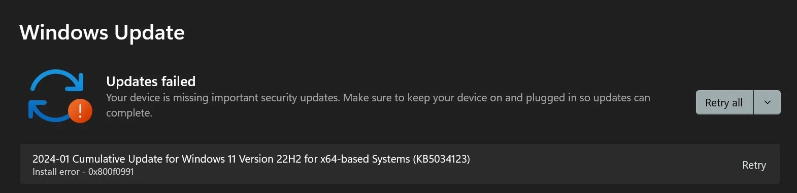 Conforme detectado pela primeira vez pelo site Windows Latest, a grande atualização de segurança KB5034123 deste mês para o Windows 11 não se pode instalar devido a mensagens de erro vagas, com o código 0x800f081f a ser destacado por mais utilizadores. No Feedback Hub, os utilizadores também assinalaram outros erros de instalação como o 0x80188309.