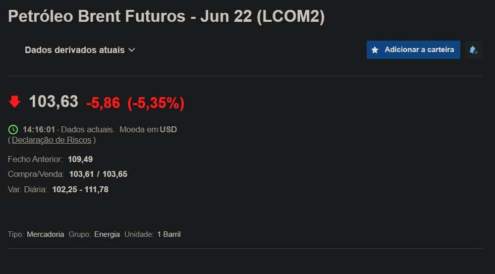 Entretanto, enquanto andamos a lidar com estes aumentos, o Barril de Petróleo começou a baixar muito significativamente de valor no passado domingo, tendência que continuou na passada segunda-feira, e também nesta terça-feira. (Na semana passada chegou aos 120 dólares por barril. Ontem estava a 109 dólares, e hoje já está nos 103 dólares.) Fonte