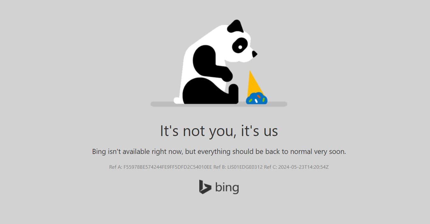Ao visitar o Bing, aparece uma mensagem de erro a confirmar que It’s not you, it’s us, ou em português, “não é você, somos nós”.