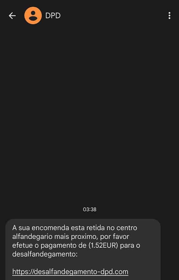 >Portanto, este é um exemplo de um SMS que recebi durante o dia de hoje. Aparentemente proveniente da DPD, ou seja, com todo o aspeto de ser oficial e não um novo Scam. Mas, a mensagem é na realidade falsa! Basta olhar para o site para perceber que aquele não é o domínio da DPD.