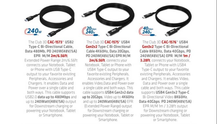 De facto, este site de notícias descobriu que uma loja americana chamada Club3D nos Estados Unidos começou a anunciar três cabos que disponibilizam até 240W de energia. Dois deles foram feitos para transmitir corrente, dados e vídeo. Entretanto o modelo de topo permite uma passagem de dados de 40 Gbps. Isto permite a transmissão de vídeos 8k a 60fps. O terceiro foi desenvolvido sobretudo para a transferência de dados, mas é menos útil que os outros dois. Isto porque é um pouco mais lento.