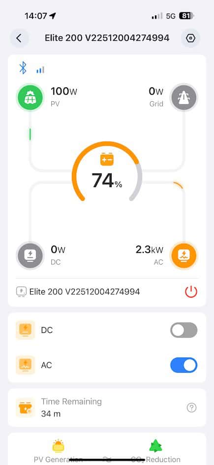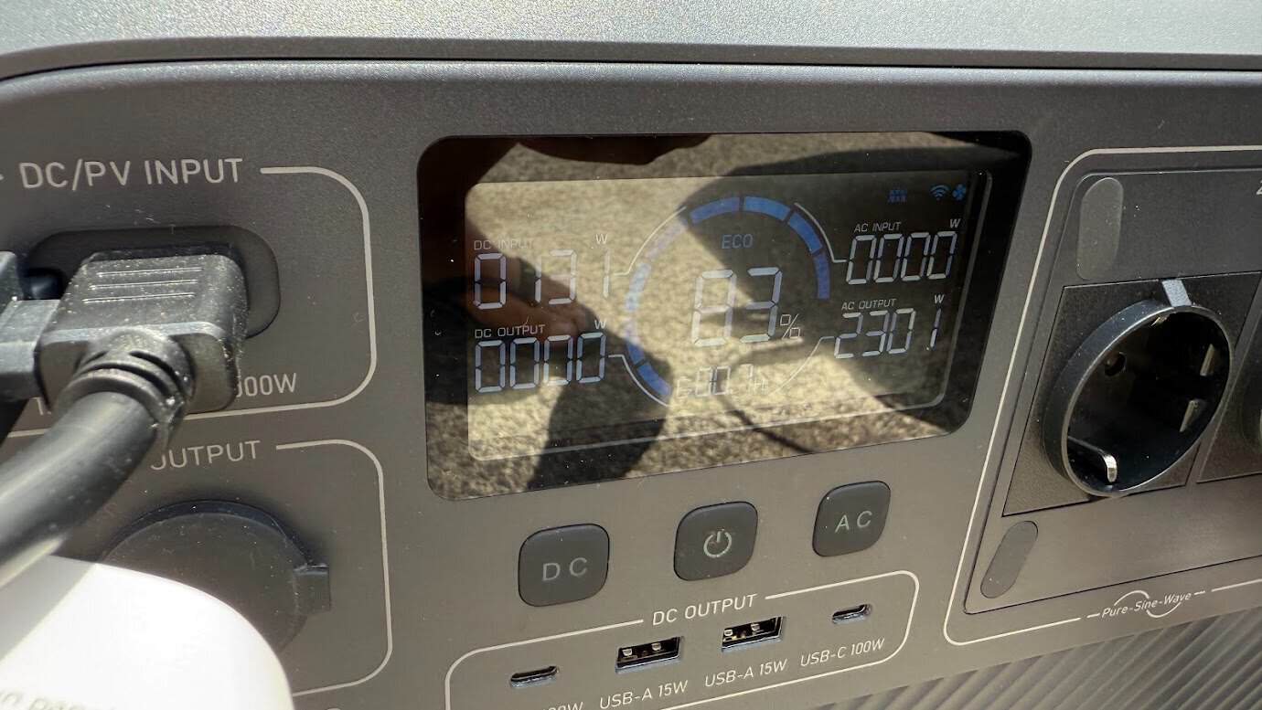 A solução foi bem mais limpa e autónoma: uma estação portátil da Bluetti, mais precisamente a Elite 200 v2, com direito a painéis solares.