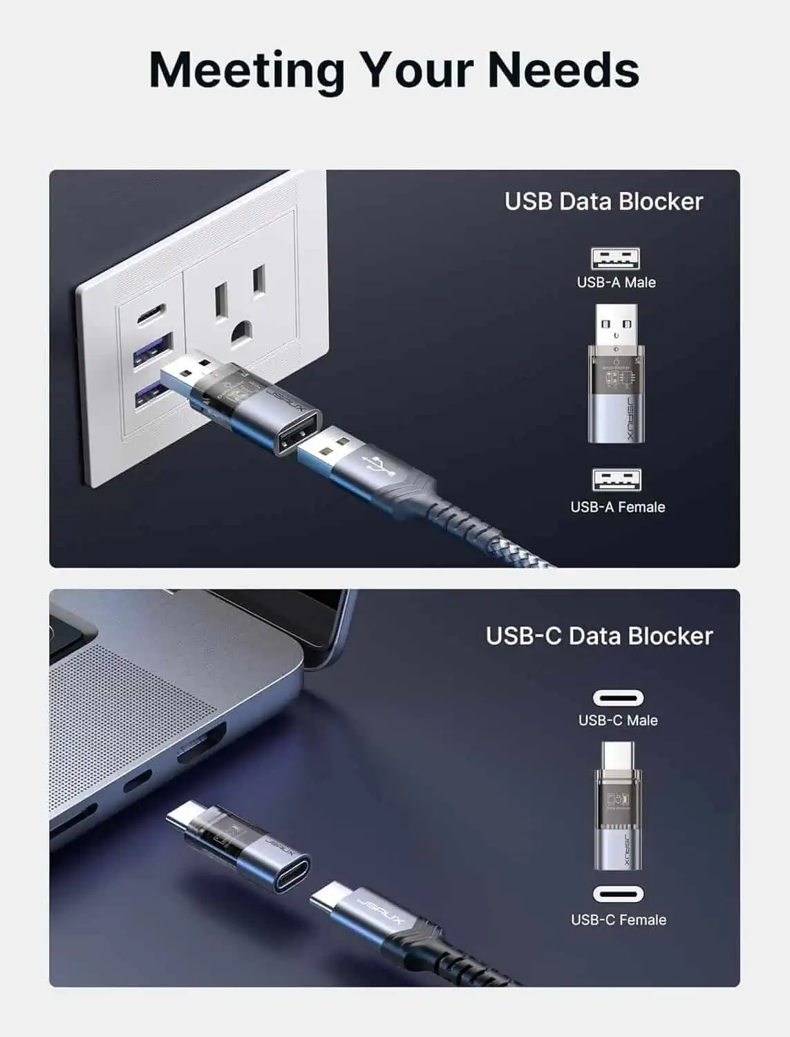 Um dos modelos mais populares é o JSAUX USB Data Blocker, que vem num pack de quatro unidades (dois USB-C e dois USB-A). Um pack que custa cerca de 10 euros.