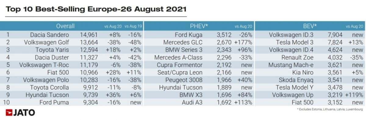 Mais concretamente, o VW ID.3 é o carro elétrico mais vendido, sendo seguido pelo Tesla Model 3 na segunda posição, e finalmente, o VW ID.4 na terceira posição do top 3. No campo dos híbridos plug-in, temos o Ford Kuga a liderar, perseguido de perto pelo Mercedes GLC e BMW Serie 3.