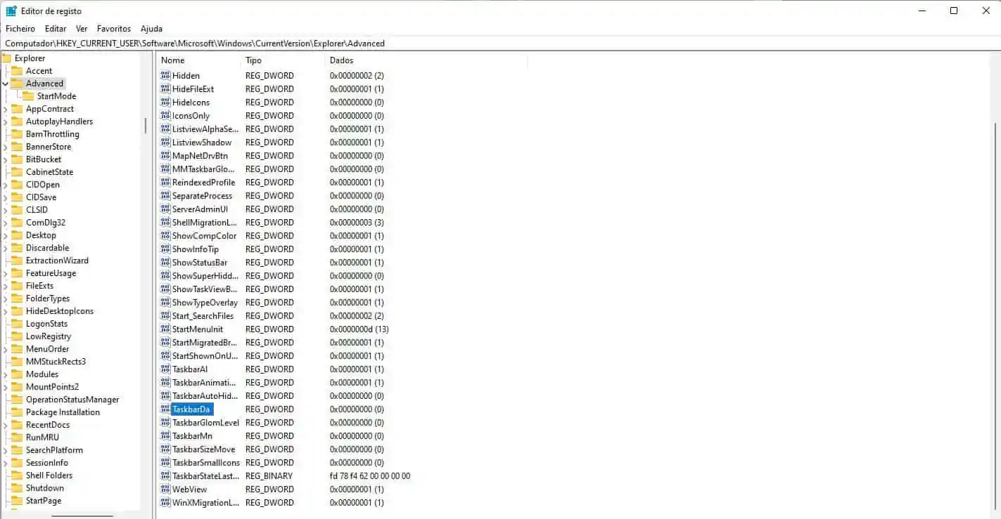 Agora navegue até à chave Computador\HKEY_CURRENT_USER\Software\Microsoft\Windows\CurrentVersion\Explorer\Advanced