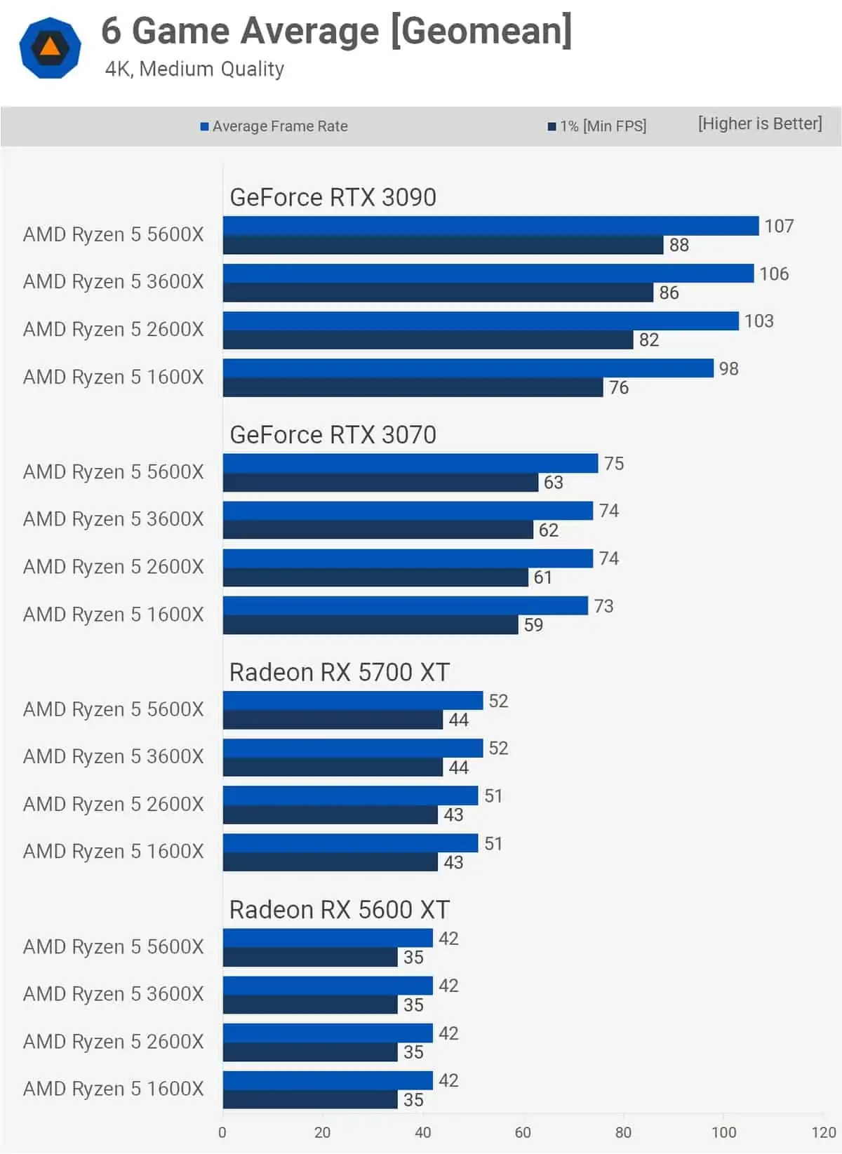 Em suma, um processador como um Ryzen 5 1600X ainda é um chip muito decente em 2021. Claro que o Ryzen 5600X é quase 50% mais rápido com uma RTX 3090 responsável pelos gráficos, mas se meter um Ryzen 1600X com uma placa gráfica mais modesta como uma GTX 1660 Ti ou RX 5600XT, vai perceber que ainda é uma solução muito equilibrada para 2021. (Até porque na verdade, faz muito pouco sentido ter uma RTX 3090 na mesma máquina que um Ryzen 5 1600X.)