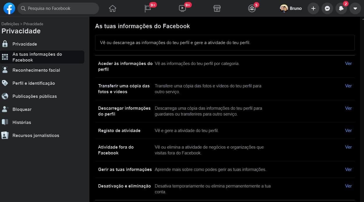 Depois na nova janela do lado esquerdo só tem de dar um clique em As tuas informações do Facebook. Logo a seguir clique em Transferir uma cópia das fotos e vídeos.