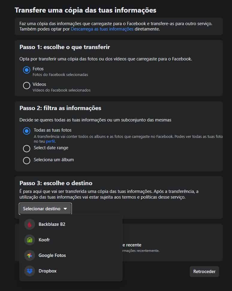 Mas para além disso e como esta ferramenta está mesmo completa também pode indicar se quer transferir todas as fotos ou então escolher um intervalo específico. Também pode selecionar apenas um álbum. Por fim é só dar um clique em Selecionar Destino e depois optar, neste caso, pelo Google Fotos.
