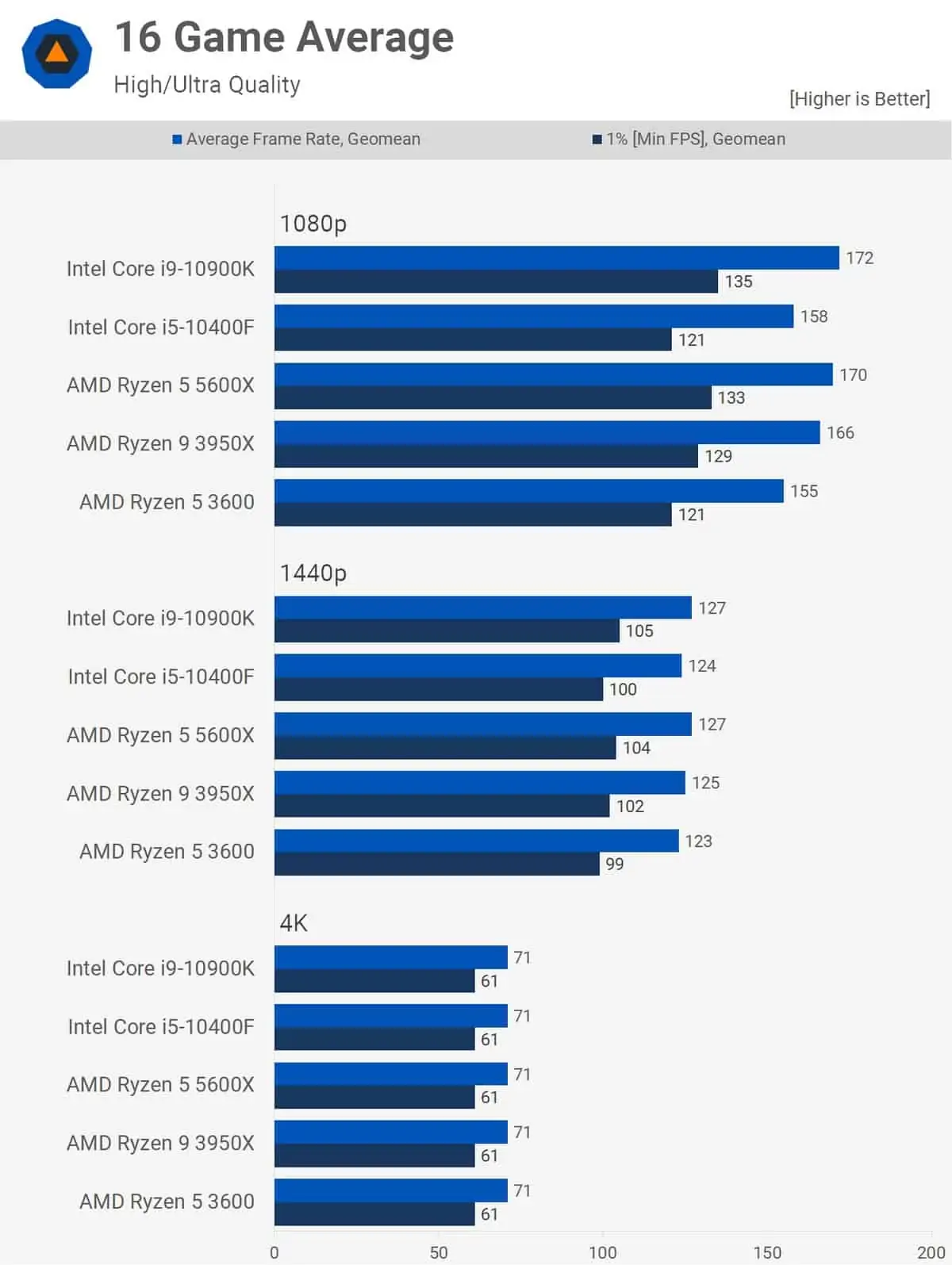 Os velhinhos e por isso também mais baratos Core i5-10400F (que está a um preço fenomenal de menos de 150€) e sempre famoso Ryzen 5 3600, irão comportar-se muito bem ao lado de uma RTX 3070 ou RX 6800. Poupando-lhe algum dinheiro no processo. (Ou possibilitando upgrades no campo da memória RAM, SSD, ou até numa placa mais poderosa)