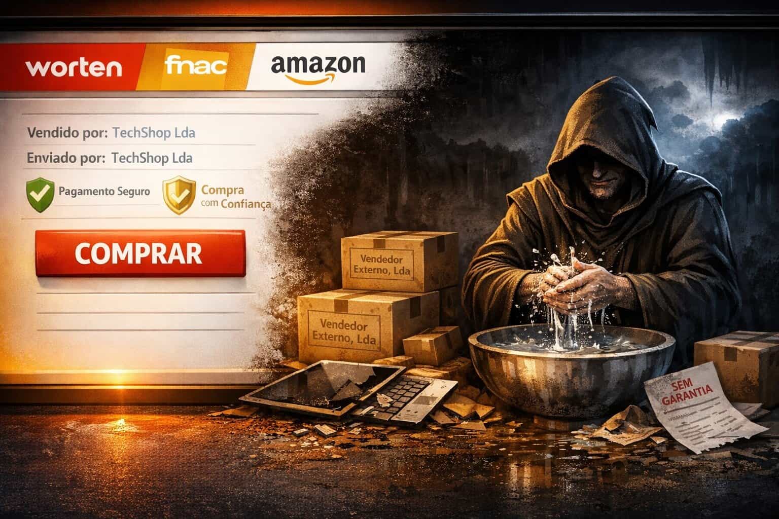 Entras no site da Worten, da Fnac ou da Amazon. Vês o logótipo de confiança no canto do ecrã, as cores familiares, o sistema de pagamento seguro que já conheces. Compras o produto. O problema surge depois: quando algo corre mal, a marca lava as mãos e diz que isso não foi com eles, mas sim com o Vendedor Externo, Lda. Bem-vindo ao lado negro dos Marketplaces. É por isso que comprar na Worten ou Fnac pode não significar necessariamente nada.