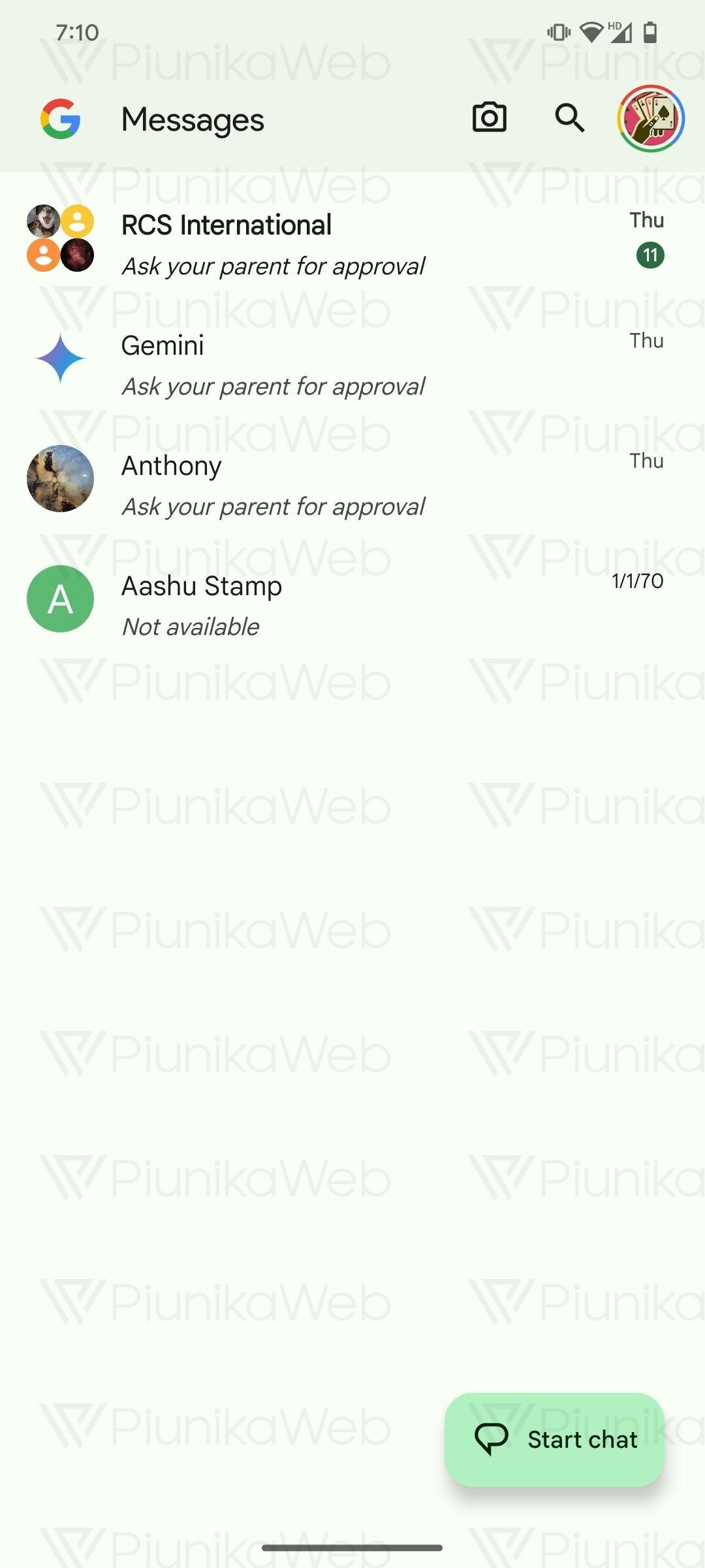 Ao abrir uma conversa individual ou de grupo restrita, aparece uma conversa em branco com as palavras “Para enviar, peça a aprovação dos seus pais”. Entretanto, a lista de conversas também não revela o conteúdo das mensagens, pedindo à criança que obtenha a autorização dos pais ou do tutor. O PiunikaWeb refere que estes controlos parentais podem-se aplicar tanto a conversas SMS normais como a conversas RCS.
