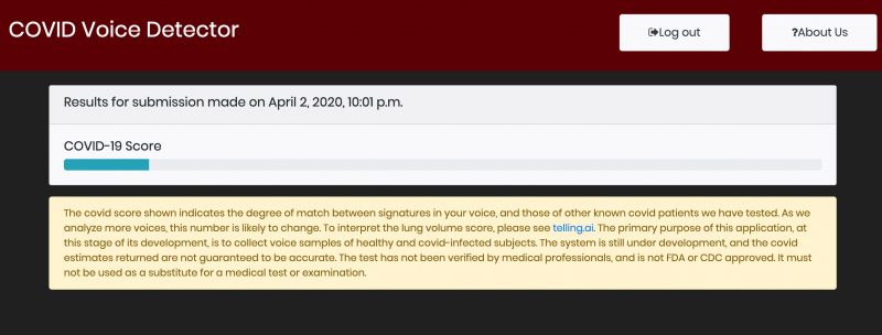 O mesmo método que referimos acima pode ser aplicado a qualquer tipo de dados, incluindo áudio. E foi exatamente isso que a equipa de Benjamin Striner, Bhiksha Raj e Rita Singh fizeram. Assim, a aplicação desenvolvida por cientistas e engenheiros da Universidade Carnegie Mellon começa por recolher amostras de voz. Depois essas amostras são então analisadas pela rede neural, fornecendo uma pontuação que compara a sua hipótese de estar infetado com a de pacientes confirmados com COVID-19 e pessoas limpas da infecção.