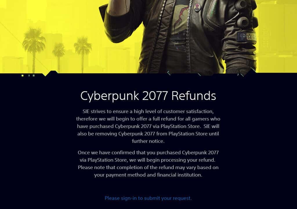 Parece que 2020 acabou por não ser um ano de sonho para a CD Projekt Red. Apesar de inicialmente, o Cyberpunk 2077 ter recebido algumas reviews interessantes, apesar dos problemas de que tanto se tem falado, especialmente em consolas como a PS4 e não só, acaba de levar o maior golpe de sempre. É que a Sony acaba de o remover da PlayStation Store. Para além disso, quem comprou a versão digital tem direito a um reembolso. Isto chega alguns dias depois da moda do reembolso ter começado e de se ter falado disso tantas vezes na Internet. O processo é simples. A Sony vai confirmar se o utilizador comprou o Cyberpunk 2077 através da Playstation Store e logo a seguir dá início ao processo de devolução do dinheiro.