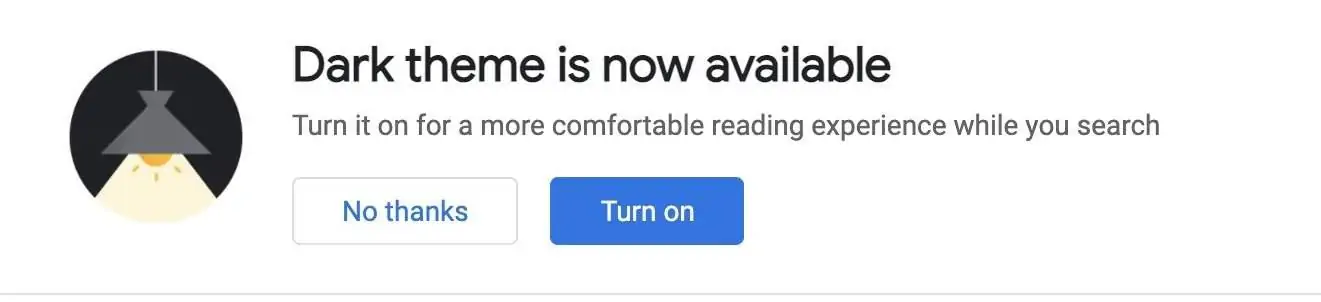 Entretanto, também pode surgir uma notificação acerca do dark mode quando procurar por algo na Google, como mostra a imagem abaixo.