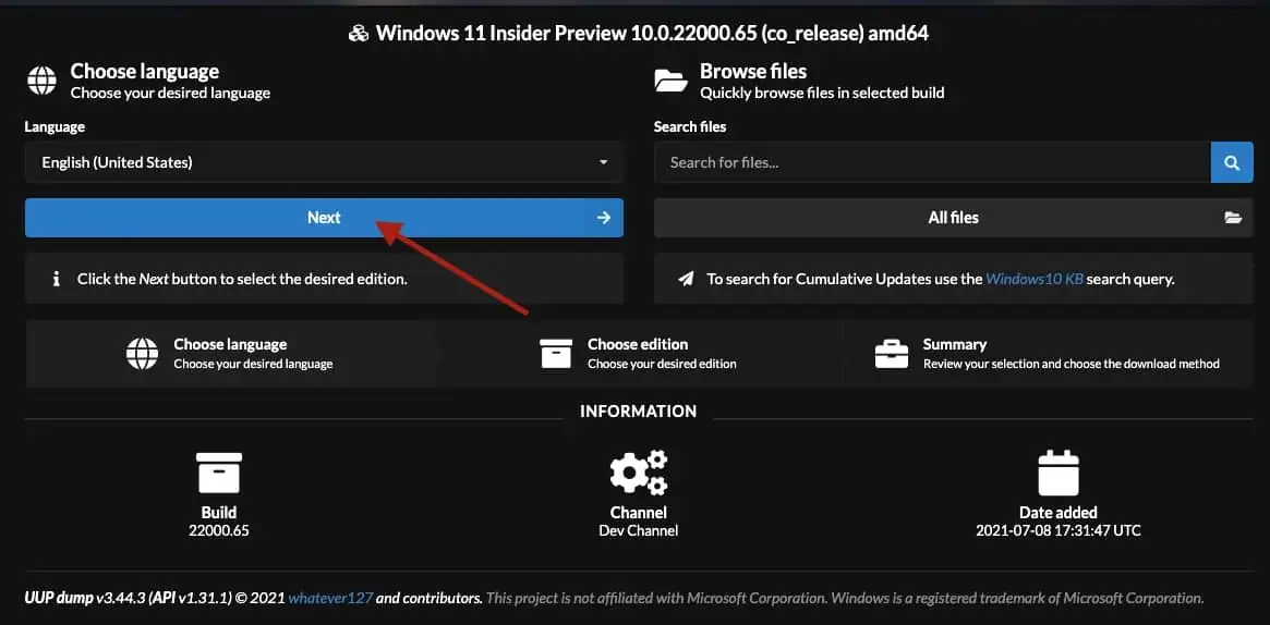Em primeiro lugar tem de se dirigir a uupdump.net. Depois deverá dar um clique na versão mais recente do Windows 11 Insider Preview for amd64. Isto mesmo que tenha um chip Intel. É que a outra versão, a arm64, é para computadores não-x86 e pode ser utilizada para se instalar, por exemplo, num Raspberry Pi.