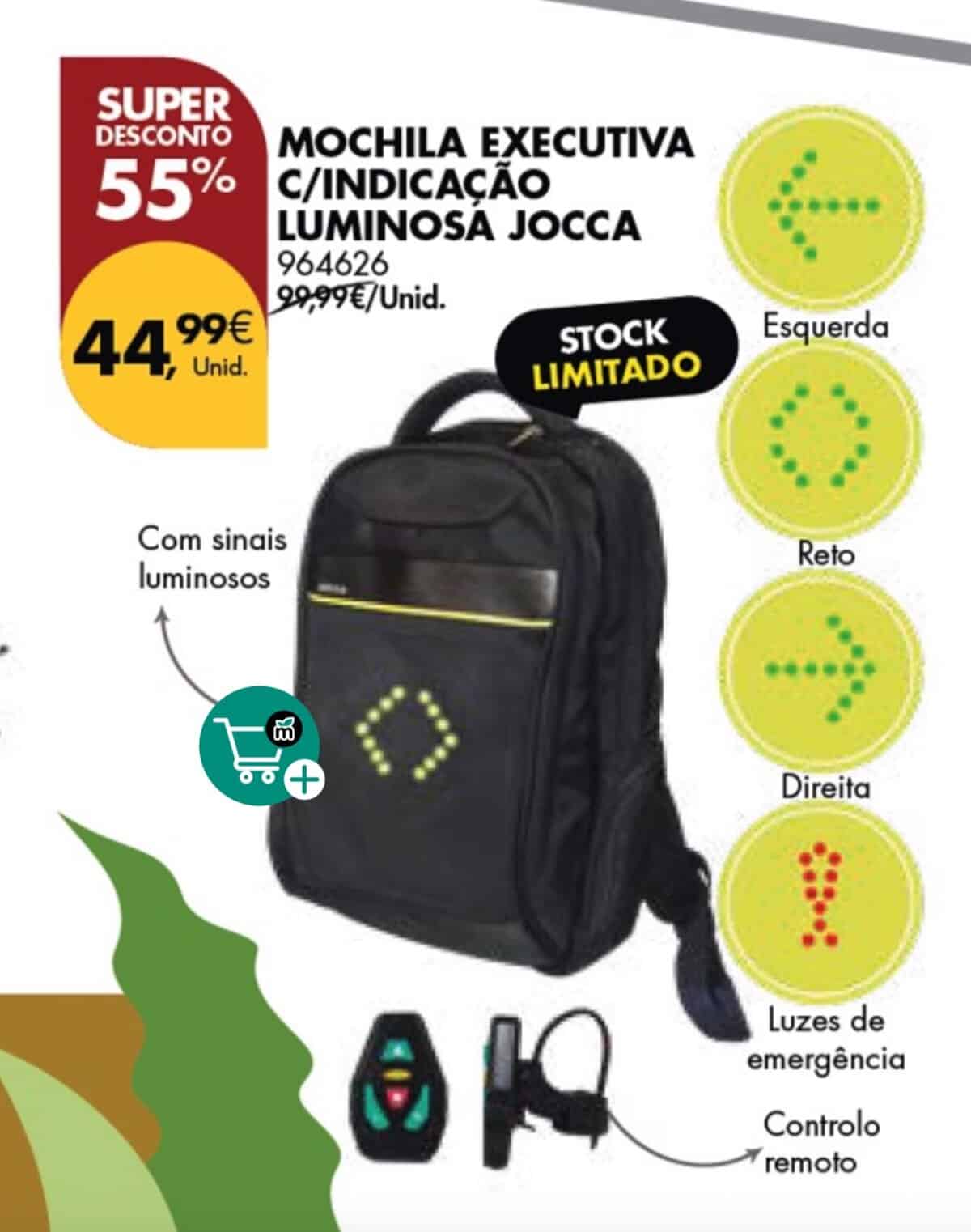 Outro produto em destaque é a mochila executiva Jocca com indicação luminosa. Assim para quem anda frequentemente de bicicleta, esta mochila ajuda a aumentar a visibilidade na estrada. Entretanto possui luzes traseiras com setas (esquerda, direita, frente, emergência), todas controladas por comando remoto. Está com 55% de desconto e custa agora apenas 44,99€. Um investimento pequeno com um impacto enorme na segurança.