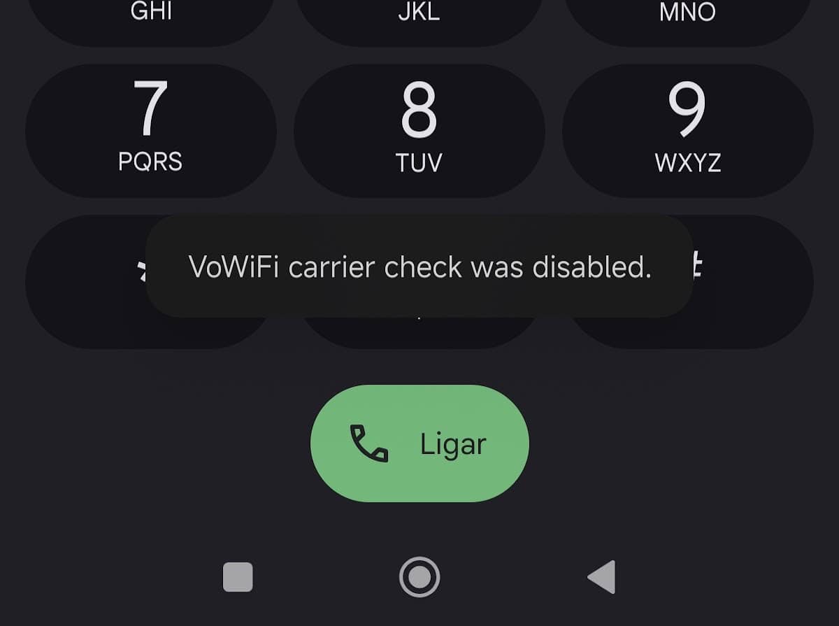 Vá novamente as chamadas e escreva *#*#869434#*#*. Assim que terminar surge a mensagem VoWIFI Carrier check was disabled.